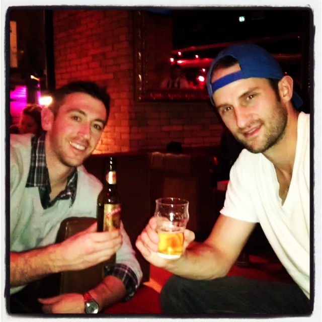 | {Shaun and Trevor drinking the "strongest beer in the world" called La Biere du Demon. FYI, I am giving Trevor the benefit of the doubt in that he must have been so hot from the fireplace that he had to strip down in that under-shirt} |